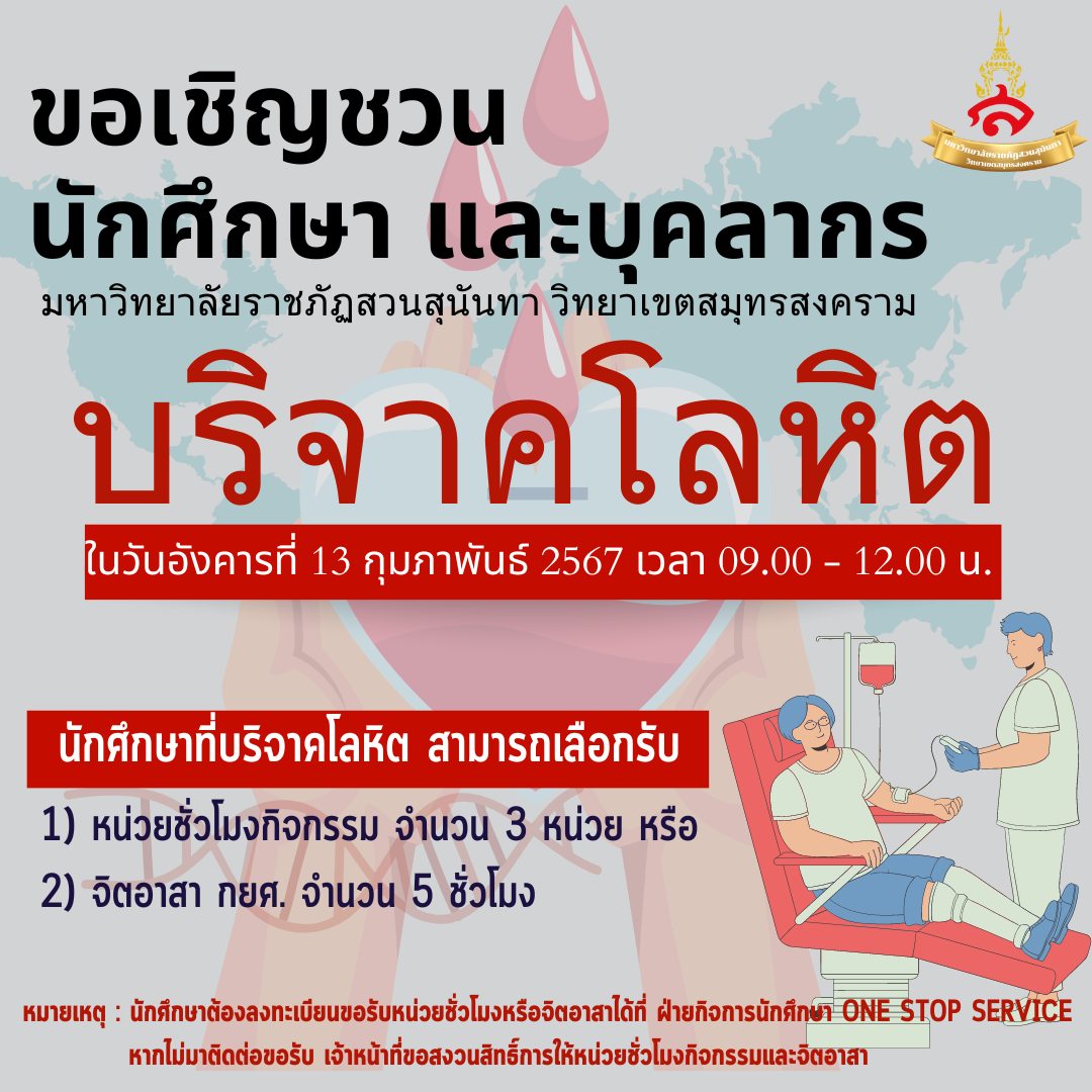 Donate blood on Tuesday, February 13, 2024 from 9:00 a.m. - 12:00 p.m. at Phadungchiva Building. Suan Sunandha Rajabhat University Samut Songkhram Campus
