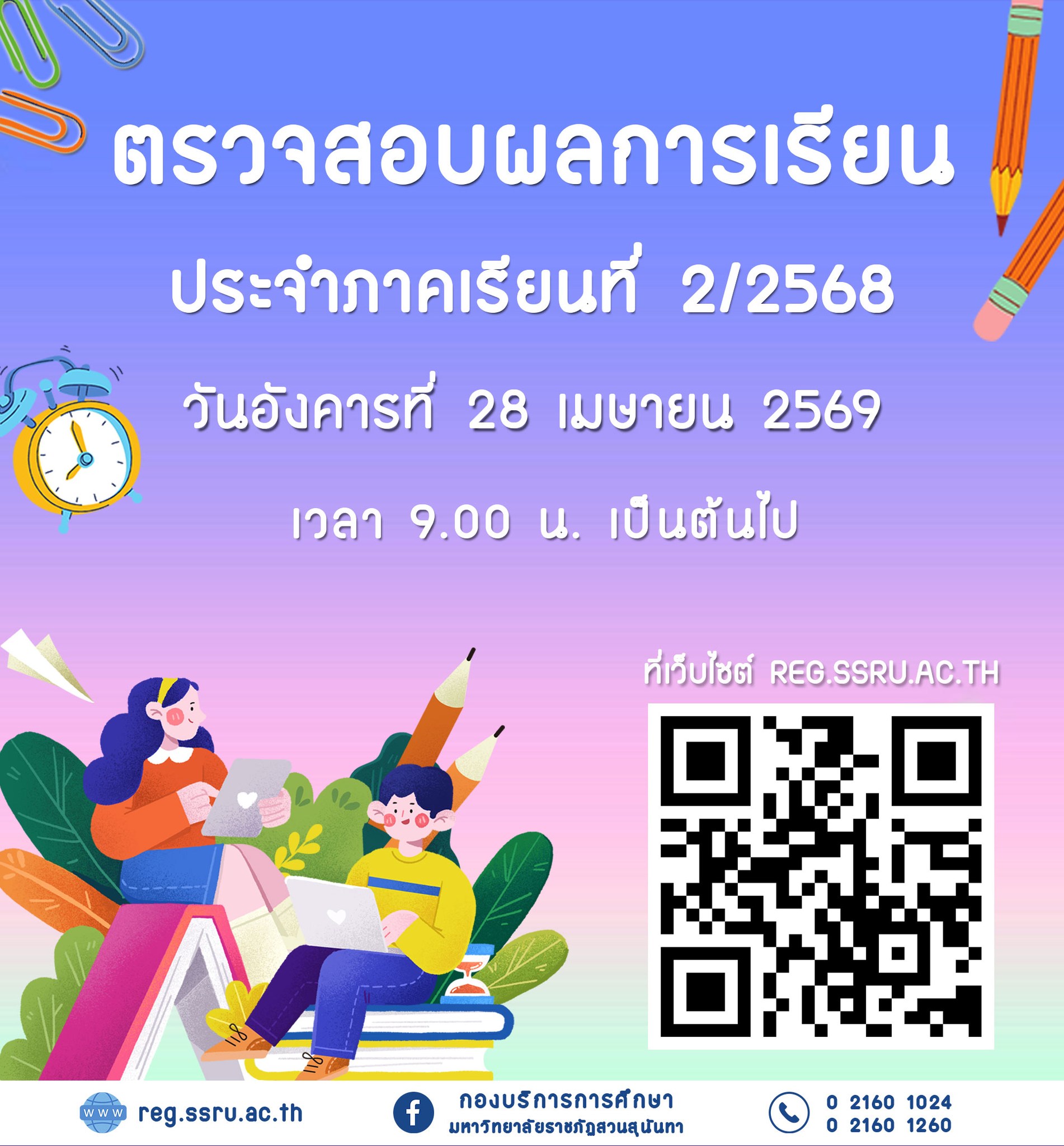 > ตรวจสอบผลการเรียน ประจำภาคเรียนที่ 2 ปีการศึกษา 2568 ตั้งแต่วันอังคารที่ 28 เมษายน 2569 เป็นต้นไป