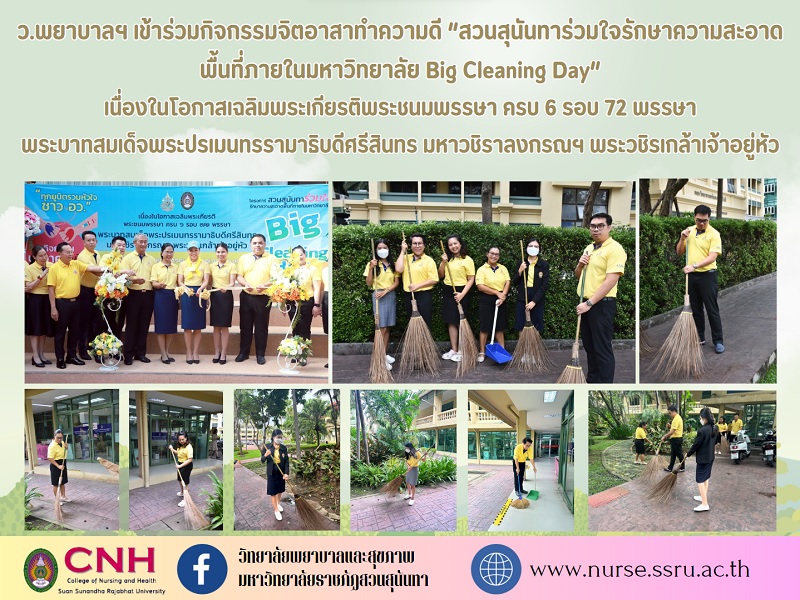 On July 10, 2024, College of Nursing and Health Participated in the volunteer activity "Sunanda Park Joins Forces to Maintain the Cleanliness of the Campus Big Cleaning Day" on the occasion of the 6th Anniversary of His Majesty the King's 72nd Birthday. His Majesty the King Ramathibodi Srisin Maha Vajiralongkorn, King Vachirakula, with Associate Professor Dr. Chutikarn Sriviboon. The President of Suan Sunanda Rajabhat University presided over the opening of the project at Suan Sunanda Rajabhat University, Bangkok .