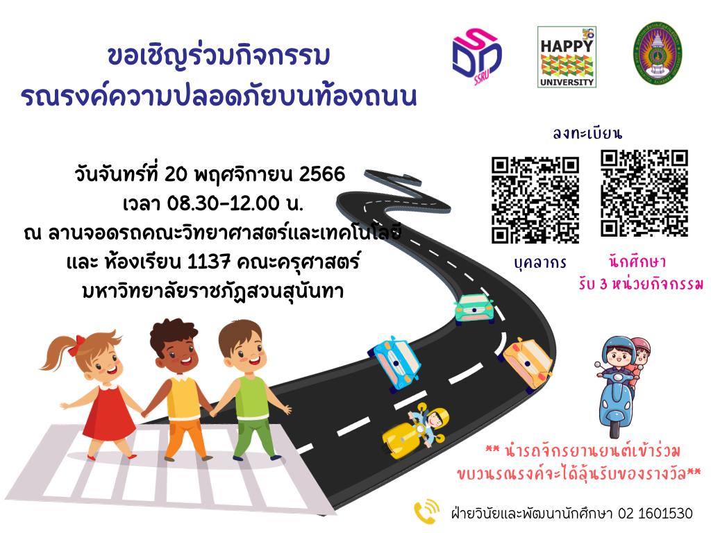 Invitation to activities Road Safety Campaign on Monday, November 20, 2023 at 08.30 a.m. at Faculty of Science and Technology Parking Lot and Classroom 1137, Faculty of Education, Suan Sunandha Rajabhat University Participants will receive 3 activity units** Those who bring motorcycles to participate in the campaign parade will win prizes