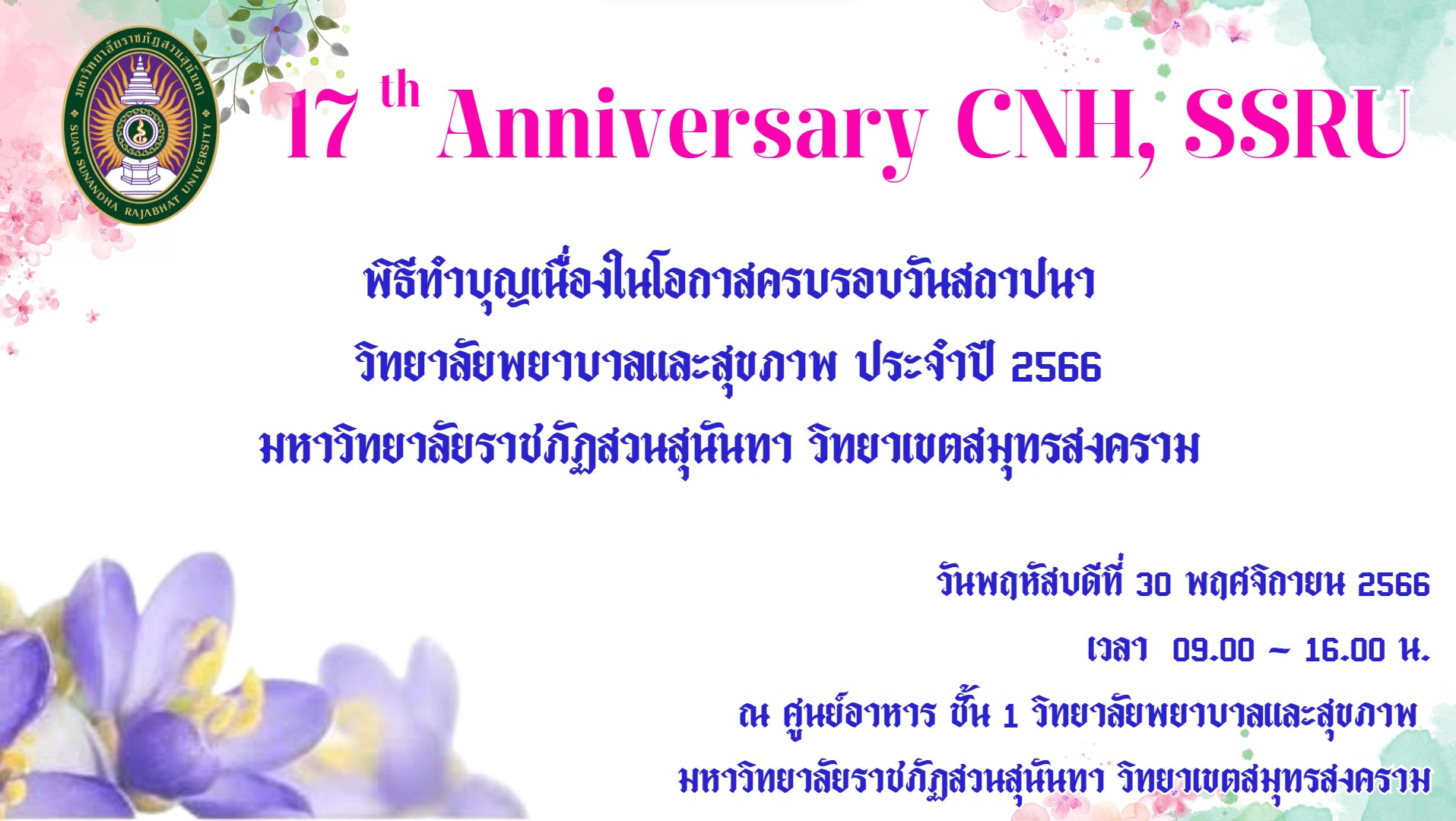 The event will be held on Thursday, November 30, 2023 at 09.00 - 16.00 hrs. at Food Court, 1st floor, College of Nursing and Health. Suan Sunandha Rajabhat University Samut Songkhram Campu