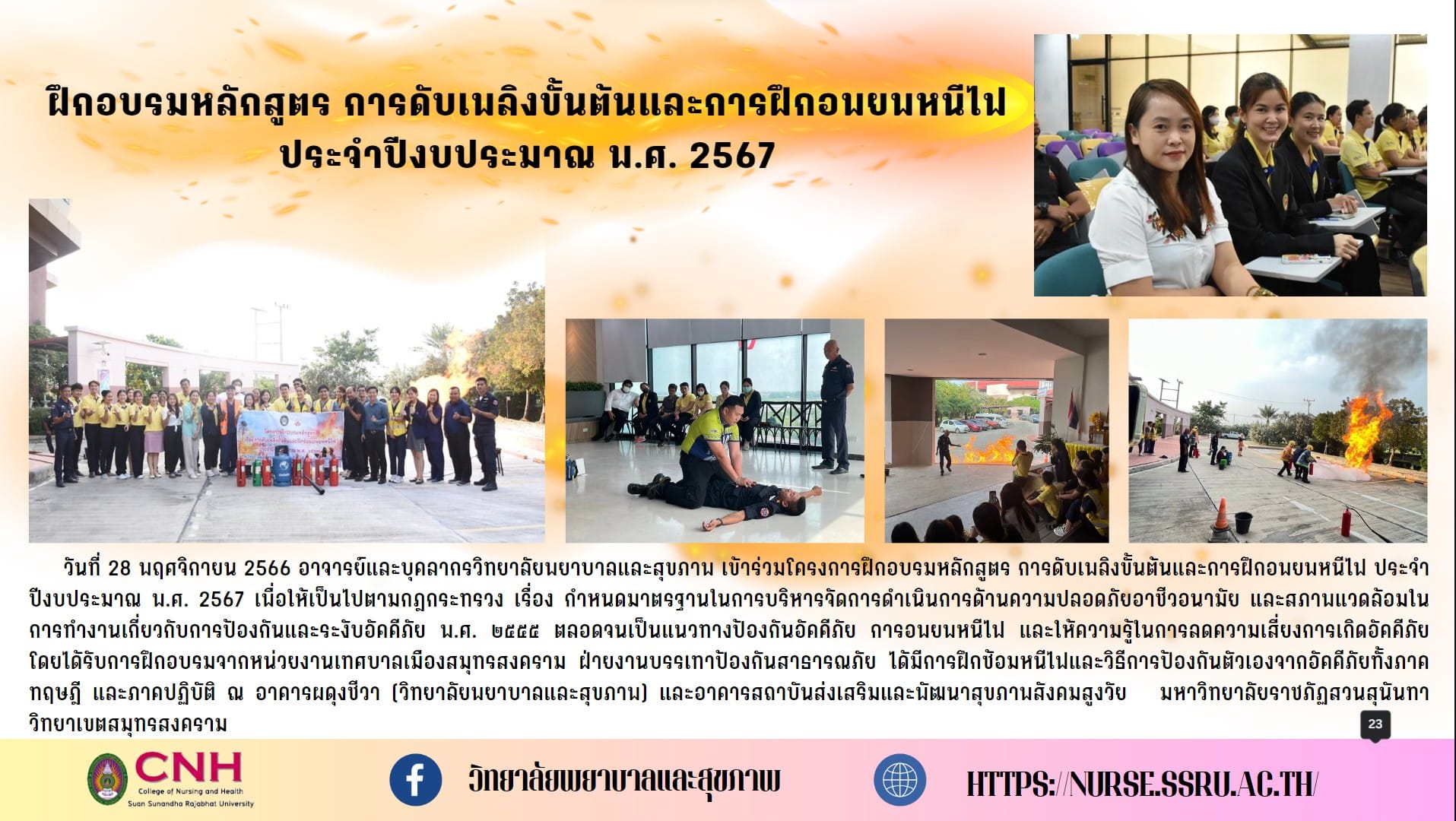 November 28, 2023 Teachers and Staff of College of Nursing and Health Participate in training programs Preliminary fire fighting and fire evacuation training for the fiscal year 2024 to comply with the Ministerial Regulation on Establishing Standards for Occupational Safety and Health and Working Environment Management on Fire Prevention and Suppression B.E. 2555 (2012) as well as fire prevention guidelines. Fire evacuation and education on reducing fire risk They have received training from the municipal authority of Samut Songkhram. Disaster Mitigation and Prevention Department Fire drills and fire prevention methods were conducted both theoretical and practical at Padung Chiva Building (College of Nursing and Health) and Institute for Health Promotion and Development of Aging Society. Suan Sunandha Rajabhat University Samut Songkhram Campus