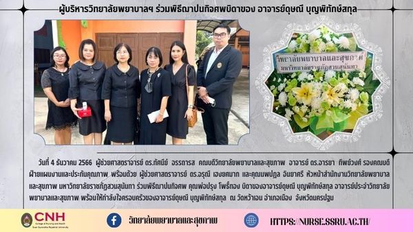 December 4, 2023 Assistant Professor Dr. Thasanee Attaaros , Dean, College of Nursing and Health , Lecturer Dr. Araya Thipwong Deputy Dean for Planning and Quality Assurance with assistant professor Dr. Arunee Hengyosmak and Ms. Noppadon Inyasri, Head of the College of Nursing and Health Suan Sunandha Rajabhat University attended the funeral ceremony Father Cook Phothong Father of Master Dusanee Boonpitaksakul Lecturer at College of Nursing and Health ready to support the family of Teacher Dusanee Boonpitaksakul at Wat Wa En, Muang District, Nakhon Pathom Province