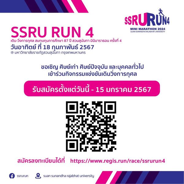 Student Development Division, Suan Sunandha Rajabhat University invites you to join the charity walk and run to support the 87-year scholarship The 4th Suan Sunandha Mini Marathon" SSRU RUN 4 on Sunday 18 February 2024 crossing Krungthon Bridge Watch the morning on both sides of the Chao Phraya River. With distance