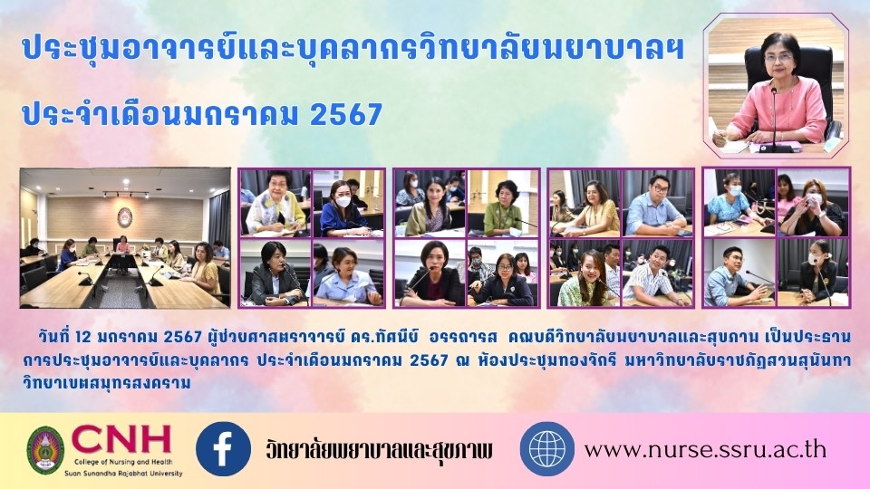January 12, 2024 Assistant Professor Dr. Tasanee Attharos, Dean of the College of Nursing and Health Chairing meetings of teachers and staff for January 2024 at Thong Chakri Meeting Room Suan Sunandha Rajabhat University Samut Songkhram Campus