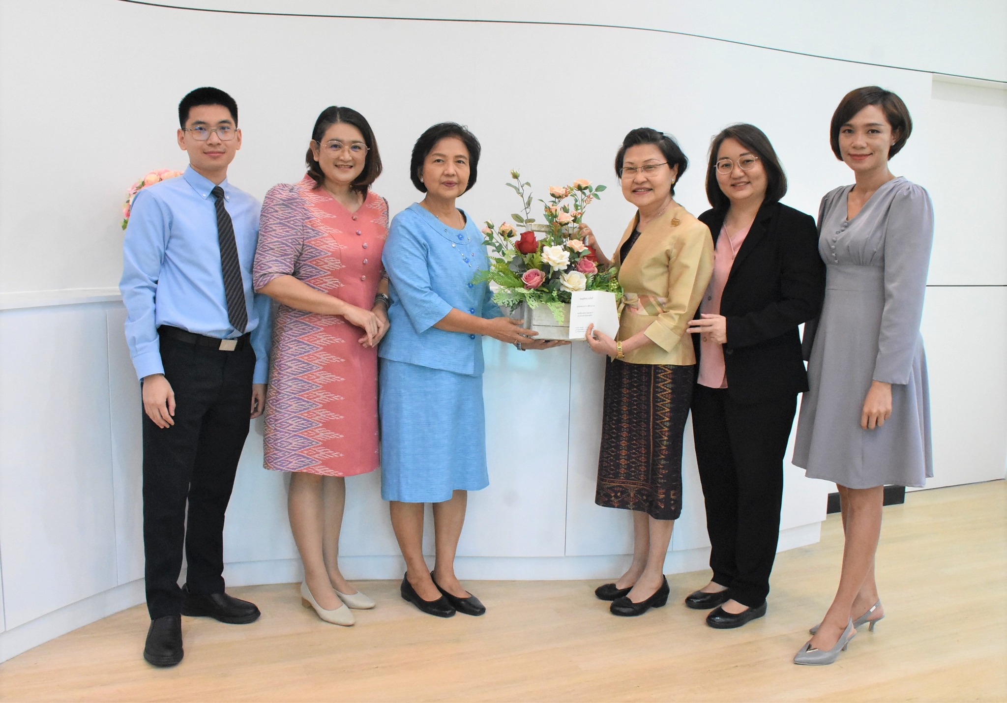 Dean of the College of Nursing and Health receiving flowers to congratulate Lecturer of Pediatric Nursing Academic Group on the occasion of being appointed as Dean of the College of Nursing and Health