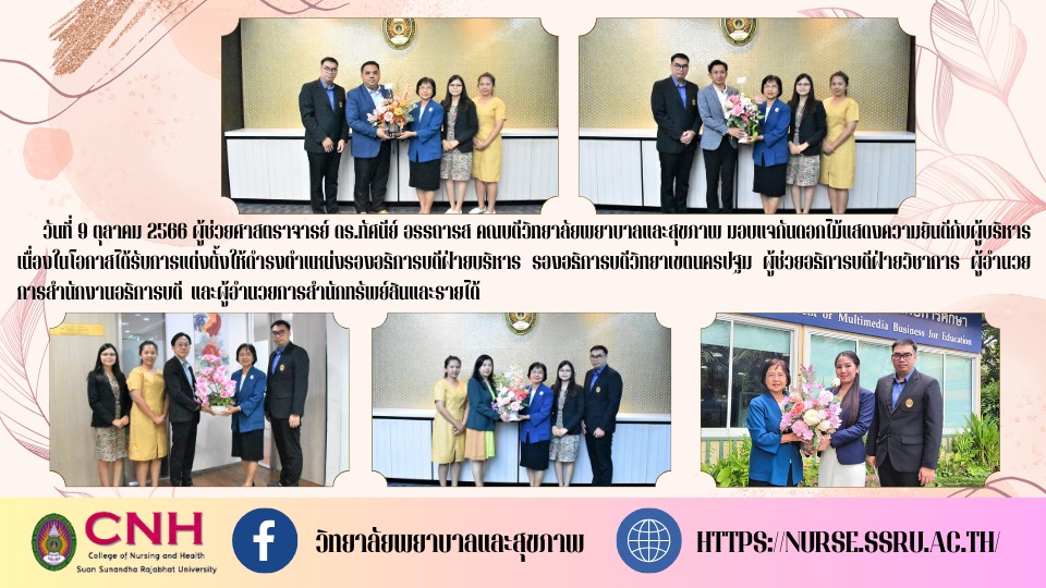 วันที่ 9 ตุลาคม 2566 ผู้ช่วยศาสตราจารย์ ดร.ทัศนีย์ อรรถารส คณบดีวิทยาลัยพยาบาลและสุขภาพ มอบแจกันดอกไม้แสดงความยินดีกับผู้บริหารเนื่องในโอกาสได้รับการแต่งตั้งให้ดำรงตำแหน่งรองอธิการบดีฝ่ายบริหาร รองอธิการบดีวิทยาเขตนครปฐม ผู้ช่วยอธิการบดีฝ่ายวิชาการ ผู้อำนวยการสำนักงานอธิการบดี และผู้อำนวยการสำนักทรัพย์สินและรายได้