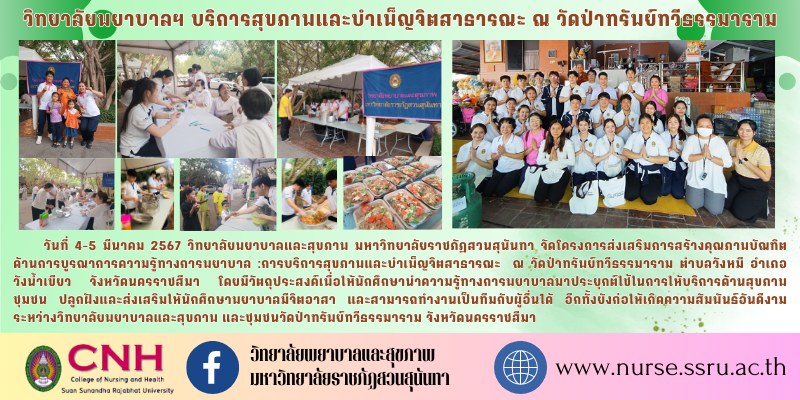 วันที่ 4-5 มีนาคม 2567 วิทยาลัยพยาบาลและสุขภาพ มหาวิทยาลัยราชภัฏสวนสุนันทา จัดโครงการส่งเสริมการสร้างคุณภาพบัณฑิตด้านการบูรณาการความรู้ทางการพยาบาล :การบริการสุขภาพและบำเพ็ญจิตสาธารณะ ณ วัดป่าทรัพย์ทวีธรรมาราม ตำบลวังหมี อำเภอวังน้ำเขียว จังหวัดนครราชสีมา โดยมีวัตถุประสงค์เพื่อให้นักศึกษานำความรู้ทางการพยาบาลมาประยุกต์ใช้ในการให้บริการด้านสุขภาพชุมชน ปลูกฝังและส่งเสริมให้นักศึกษาพยาบาลมีจิตอาสา และสามารถทำงานเป็นทีมกับผู้อื่นได้ อีกทั้งยังก่อให้เกิดความสัมพันธ์อันดีงามระหว่างวิทยาลัยพยาบาลและสุขภาพ และชุมชนวัดป่าทรัพย์ทวีธรรมาราม จังหวัดนครราชสีมา