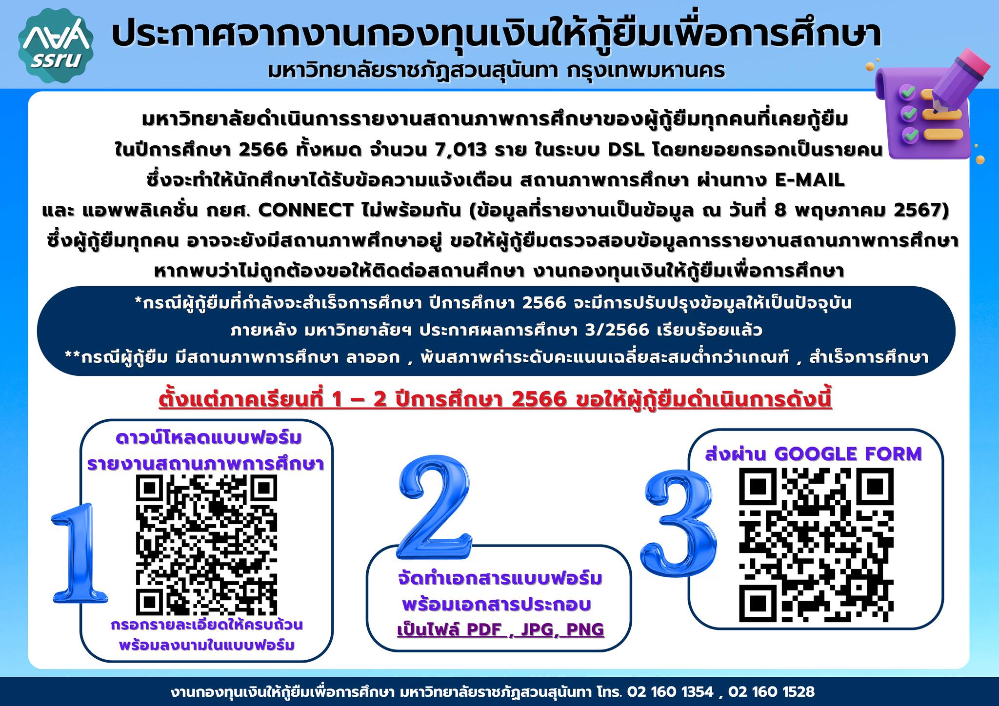 มหาวิทยาลัยดำเนินการรายงานสถานภาพการศึกษาของผู้กู้ยืมทุกคนที่เคยกู้ยืม ในปีการศึกษา 2566 ทั้งหมด จำนวน 7,013 ราย ในระบบ DSl โดยทยอยกรอกเป็นรายคน ซึ่งจะทำให้นักศึกษาได้รับข้อความแจ้งเตือน สถานภาพการศึกษา ผ่านทาง e-mail และ แอพพลิเคชั่น กยศ. Connect ไม่พร้อมกัน (ข้อมูลที่รายงานเป็นข้อมูล ณ วันที่ 8 พฤษภาคม 2567)