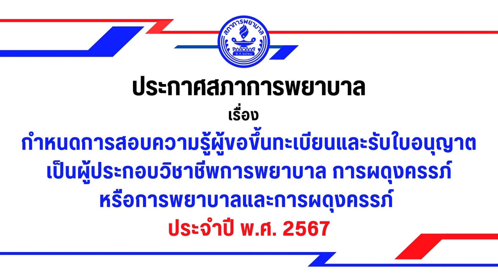 ประกาศสภาการพยาบาล เรื่อง กำหนดการสอบความรู้ผู้ขอขึ้นทะเบียนและรับใบอนุญาตเป็นผู้ประกอบวิชาชีพการพยาบาล การผดุงครรภ์ หรือการพยาบาลและการผดุงครรภ์ ประจำปี พ.ศ. 2567