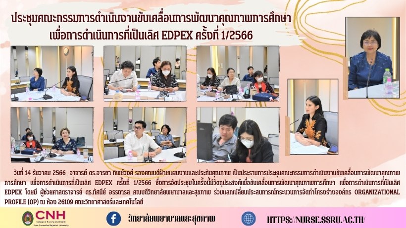 วันที่ 14 ธันวาคม 2566 อาจารย์ ดร.อารยา ทิพย์วงศ์ รองคณบดีฝ่ายแผนงานและประกันคุณภาพ เป็นประธานการประชุมคณะกรรมการดำเนินงานขับเคลื่อนการพัฒนาคุณภาพการศึกษา เพื่อการดำเนินการที่เป็นเลิศ EdPEx ครั้งที่ 1/2566 ซึ่งการจัดประชุมในครั้งนี้มีวัตถุประสงค์เพื่อขับเคลื่อนการพัฒนาคุณภาพการศึกษา เพื่อการดำเนินการที่เป็นเลิศ EdPEx โดยมี ผู้ช่วยศาสตราจารย์ ดร.ทัศนีย์ อรรถารส คณบดีวิทยาลัยพยาบาลและสุขภาพ ร่วมแลกเปลี่ยนประสบการณ์กระบวนการจัดทำโครงร่างองค์กร Organizational Profile (OP) ณ ห้อง 26109 คณะวิทยาศาสตร์และเทคโนโลยี