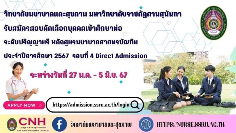 วิทยาลัยพยาบาลและสุขภาพ มหาวิทยาลัยราชภัฏสวนสุนันทา รับสมัครนักศึกษาใหม่ หลักสูตรพยาบาลศาสตรบัณฑิต ภาคปกติ ระดับปริญญาตรี ประจำปีการศึกษา 2567 รอบที่ 4 Direct Admission