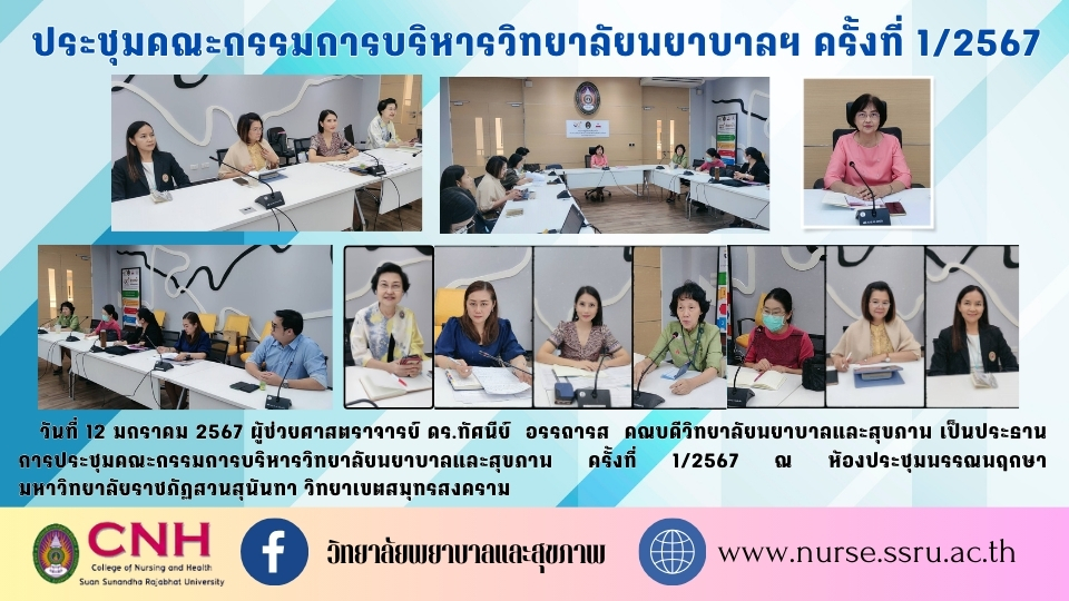 วันที่ 12 มกราคม 2567 ผู้ช่วยศาสตราจารย์ ดร.ทัศนีย์ อรรถารส คณบดีวิทยาลัยพยาบาลและสุขภาพ เป็นประธานการประชุมคณะกรรมการบริหารวิทยาลัยพยาบาลและสุขภาพ ครั้งที่ 1/2567 ณ ห้องประชุมพรรณพฤกษา มหาวิทยาลัยราชภัฏสวนสุนันทา วิทยาเขตสมุทรสงคราม