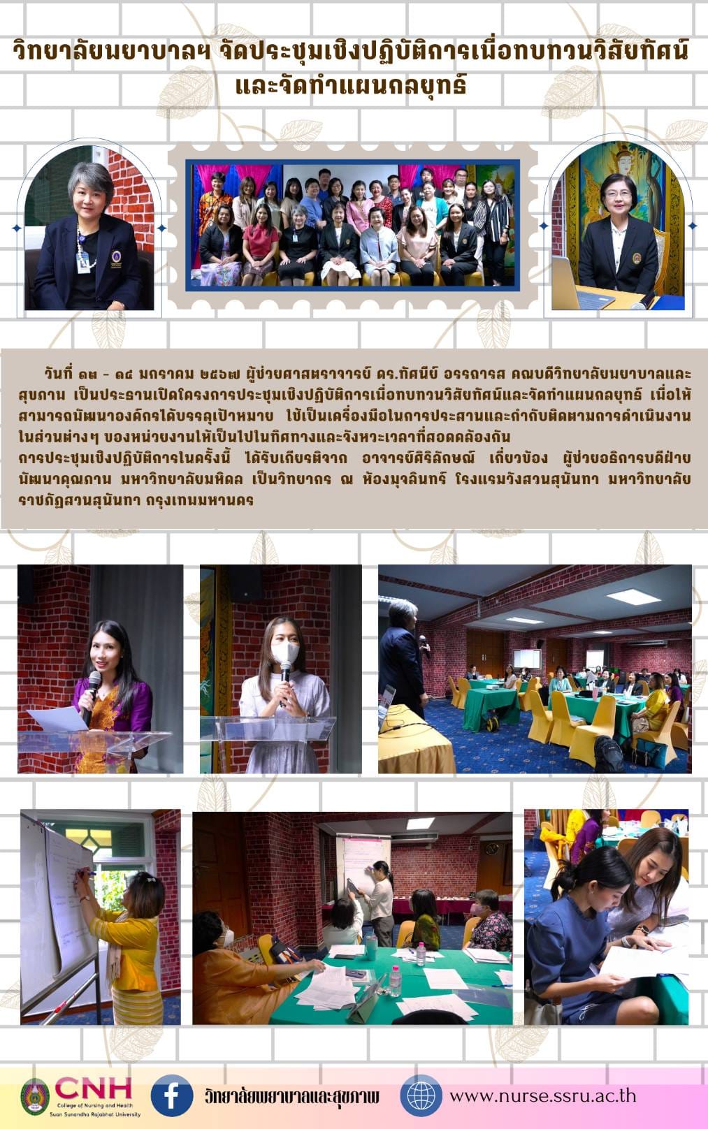 วันที่ ๑๓ – ๑๔ มกราคม ๒๕๖๗ ผู้ช่วยศาสตราจารย์ ดร.ทัศนีย์ อรรถารส คณบดีวิทยาลัยพยาบาลและสุขภาพ เป็นประธานเปิดโครงการประชุมเชิงปฏิบัติการเพื่อทบทวนวิสัยทัศน์และจัดทำแผนกลยุทธ์ เพื่อให้สามารถพัฒนาองค์กรได้บรรลุเป้าหมาย ใช้เป็นเครื่องมือในการประสานและกำกับติดตามการดำเนินงานในส่วนต่างๆ ของหน่วยงานให้เป็นไปในทิศทางและจังหวะเวลาที่สอดคล้องกัน
