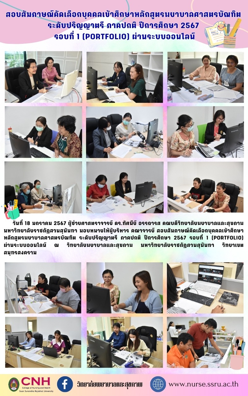 วันที่ 18 มกราคม 2567 ผู้ช่วยศาสตราจารย์ ดร.ทัศนีย์ อรรถารส คณบดีวิทยาลัยพยาบาลและสุขภาพ มหาวิทยาลัยราชภัฏสวนสุนันทา มอบหมายให้ผู้บริหาร คณาจารย์ สอบสัมภาษณ์คัดเลือกบุคคลเข้าศึกษาหลักสูตรพยาบาลศาสตรบัณฑิต ระดับปริญญาตรี ภาคปกติ ปีการศึกษา 2567 รอบที่ 1 (Portfolio) ผ่านระบบออนไลน์ ณ วิทยาลัยพยาบาลและสุขภาพ มหาวิทยาลัยราชภัฏสวนสุนันทา วิทยาเขตสมุทรสงคราม