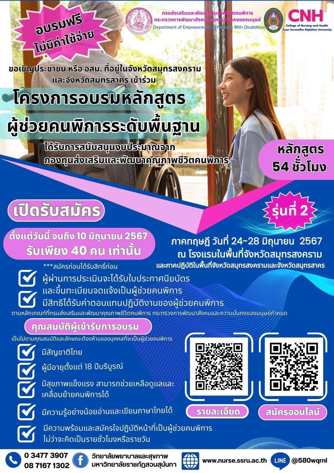 กระทรวงการพัฒนาสังคมและความมั่นคงของมนุษย์ ขอเชิญประชาชน หรือ อสม. ที่อยู่ในจังหวัดสมุทรสงครามและจังหวัดสมุทรสาคร เข้าร่วม โครงการอบรมหลักสูตรผู้ช่วยคนพิการระดับพื้นฐาน