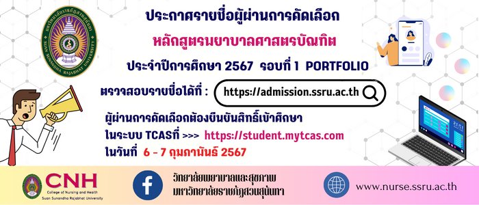 วิทยาลัยพยาบาลและสุขภาพ มหาวิทยาลัยราชภัฏสวนสุนันทา ประกาศรายชื่อผู้ผ่านคัดเลือก หลักสูตรพยาบาลศาสตรบัณฑิต ภาคปกติ ระดับปริญญาตรี ประจำปีการศึกษา 2567 (รอบที่ 1 Portfolio) สามารถตรวจสอบรายชื่อได้ที่เว็บไซต์ https://admission.ssru.ac.th/login