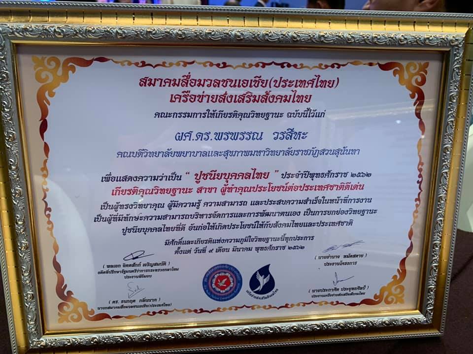 วันที่ 9 มีนาคม 2562 ณ ห้องคอนเวนชั่นฮอลล์ ศูนย์ประชุมสถาบันวิจัยจุฬาภรณ์ เขตหลักสี่ กรุงเทพมหานคร พลเอก จิตตสักก์ เจริญสมบัติ ที่ปรึกษาสภานิติบัญญัติแห่งชาติ อดีตที่ปรึกษารัฐมนตรีว่าการกระทรวงกลาโหม ประธานในพิธีฯ มอบรางวัลเกียรติคุณ วิทยฐานะ “ปูชนียบุคคลไทย” ประจำปี 2562 สาขาผู้ทำคุณประโยชน์ต่อประเทศชาติดีเด่น เพื่อเป็นการยกย่องวิทยฐานะเป็น “ปูชนียบุคคลไทย” ให้กับผู้ช่วยศาสตราจารย์ ดร.พรพรรณ วรสีหะ คณบดีวิทยาลัยพยาบาลและสุขภาพ มหาวิทยาลัยราชภัฏสวนสุนันทา ซึ่งรางวัลดังกล่าวมอบให้เพื่อเป็นขวัญและกำลังใจแก่ผู้ทำความดีเป็นแบบอย่างที่ดีของสังคมไทย เพื่อขับเคลื่อนประเทศชาติสู่อนาคตที่ยั่งยืน ซึ่งจัดโดยเครือข่ายส่งเสริมสังคมไทย ร่วมกับ สมาคมสื่อมวลชนเอเชีย(ประเทศไทย)