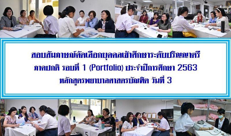 วันที่ 10 มกราคม พ.ศ. 2563 ผู้ช่วยศาสตราจารย์ ดร.พรพรรณ วรสีหะ คณบดีวิทยาลัยพยาบาลและสุขภาพ พร้อมด้วยผู้บริหาร อาจารย์สอบสัมภาษณ์และตรวจร่างกาย เพื่อคัดเลือกบุคคลเข้าศึกษาระดับปริญญาตรี หลักสูตรพยาบาลศาสตรบัณฑิต ภาคปกติ ประจำปีการศึกษา 2563 รอบที่ 1 (Portfolio) นักเรียนสามารถติดตามผลการสอบสัมภาษณ์และรายละเอียดเพิ่มเติมได้ที่ www.admission.ssru.ac.th