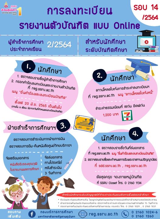 ***การลงทะเบียนและรายงานตัวบัณฑิต เพื่อรับเอกสารสำคัญทางการศึกษา ประจำปีการศึกษา 2564 รอบที่ 14/2564 สำหรับนักศึกษาระดับบัณฑิตศึกษา ตั้งแต่วันที่ 20 มิถุนายน 2565 เป็นต้นไป ที่ reg.ssru.ac.th ***