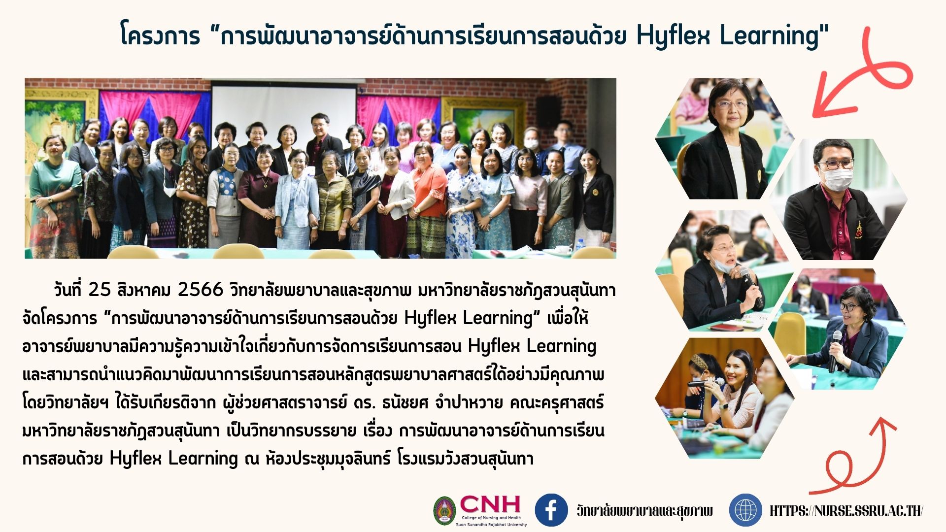 วันที่ 25 สิงหาคม 2566 วิทยาลัยพยาบาลและสุขภาพ มหาวิทยาลัยราชภัฎสวนสุนันทา จัดโครงการ “การพัฒนาอาจารย์ด้านการเรียนการสอนด้วย Hyflex Learning” เพื่อให้อาจารย์พยาบาลมีความรู้ความเข้าใจเกี่ยวกับการจัดการเรียนการสอน Hyflex Learning และสามารถนำแนวคิดมาพัฒนาการเรียนการสอนหลักสูตรพยาบาลศาสตร์ได้อย่างมีคุณภาพ โดยวิทยาลัยฯ ได้รับเกียรติจาก ผู้ช่วยศาสตราจารย์ ดร. ธนัชยศ จำปาหวาย คณะครุศาสตร์ มหาวิทยาลัยราชภัฏสวนสุนันทา เป็นวิทยากรบรรยาย เรื่อง การพัฒนาอาจารย์ด้านการเรียนการสอนด้วย Hyflex Learning ณ ห้องประชุมมุจลินทร์ โรงแรมวังสวนสุนันทา