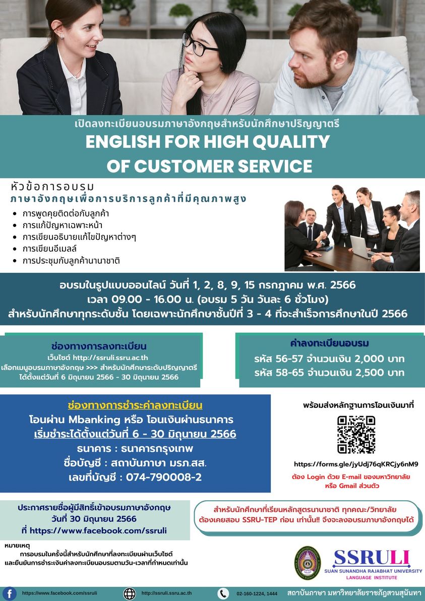เปิดลงทะเบียนอบรมภาษาอังกฤษสำหรับนักศึกษาระดับปริญญาตรี หัวข้อ “ ภาษาอังกฤษเพื่อการบริการลูกค้าที่มีคุณภาพสูง ” รุ่นที่ 1 อบรมในรูปแบบออนไลน์ ในวันที่ 1, 2, 8, 9 และ 15 กรกฏาคม 2566 สามารถลงทะเบียนได้ตั้งแต่วันนี้ จนถึงวันที่ 30 มิถุนายน 2566