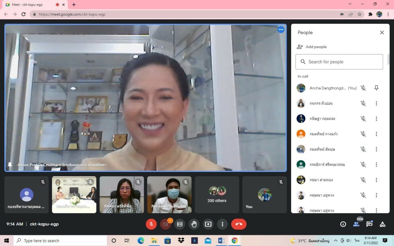 วันที่ 11 มีนาคม 2565 บุคลากรวิทยาลัยพยาบาลและสุขภาพ เข้าร่วมโครงการอบรม “การเขียนแบบประเมินค่างาน” เพื่อเตรียมความพร้อมเข้าสู่ตำแหน่งที่สูงขึ้น ประจำปีงบประมาณ 2565 ผ่านระบบออนไลน์ Google Meet จัดการอบรมโดย กองบริหารงานบุคคล