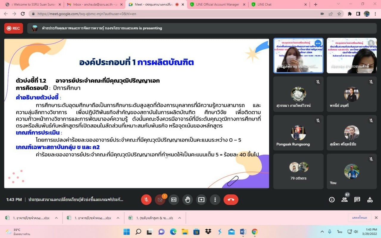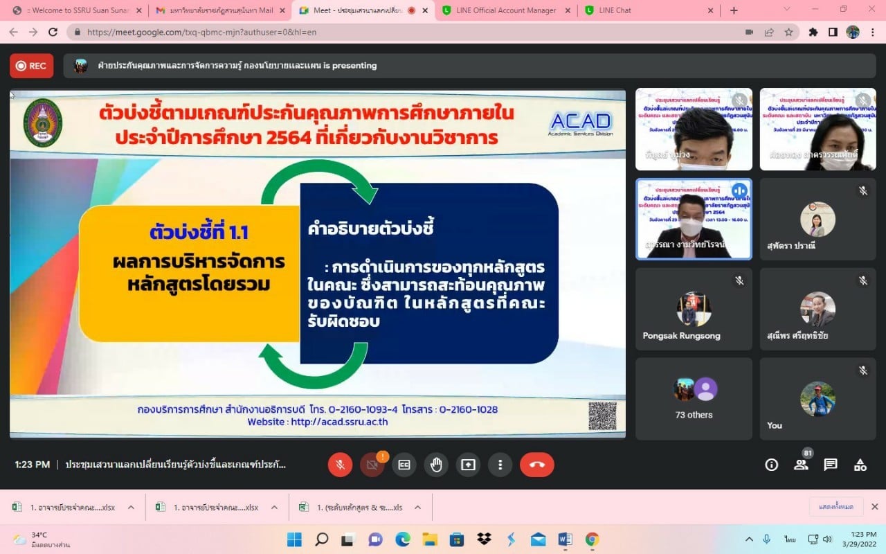 วันที่ 29 มีนาคม 2565 เวลา 13.00-16.00 น. ผู้ช่วยศาสตราจารย์ ดร.พรพรรณ วรสีหะ คณบดีวิทยาลัยพยาบาลและสุขภาพ มอบหมายให้ ผู้ช่วยศาสตราจารย์ ดร.ทัศนีย์ อรรถารส รองคณบดีฝ่ายแผนงานและประกันคุณภาพ คุณอัญชา แดงทองดี เจ้าหน้าที่ฝ่ายประกันคุณภาพ เข้าร่วมประชุมเสวนาแลกเปลี่ยนเรียนรู้แนวทางการดำเนินงานตามตัวบ่งชี้ และเกณฑ์ประกันคุณภาพการศึกษาภายใน มหาวิทยาลัยราชภัฏสวนสุนันทา ประจำปีการศึกษา 2564 ระดับคณะ และสถาบัน ในรูปแบบออนไลน์ ผ่านโปรแกรม Google Meet จัดโดยกองนโยบายและแผน