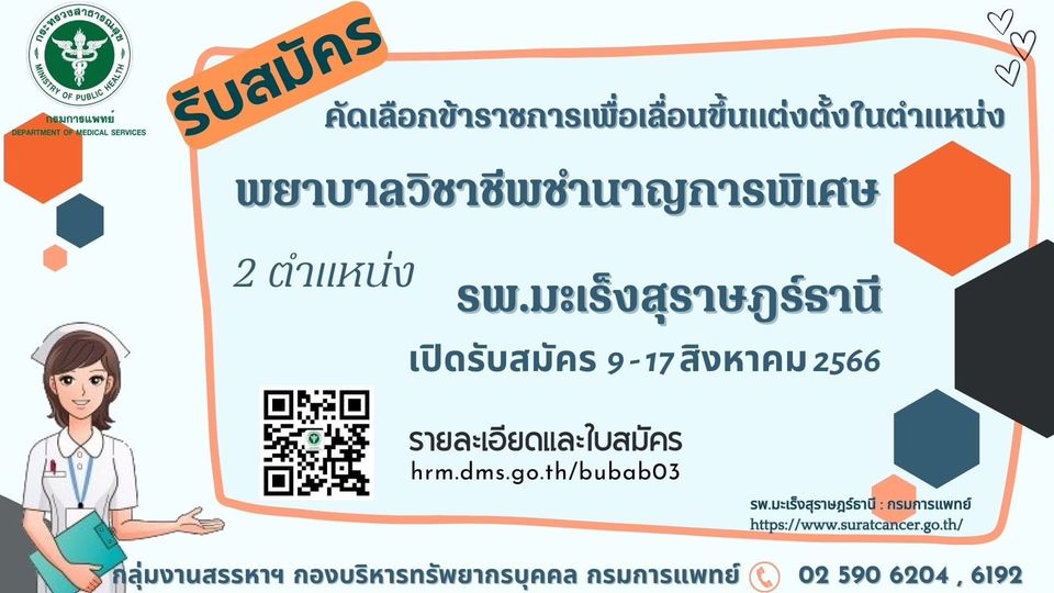 ประกาศรับสมัครคัดเลือกข้าราชการเพื่อเลื่อนขึ้นแต่งตั้งให้ดำรงตำแหน่งพยาบาลวิชาชีพชำนาญการพิเศษ โรงพยาบาลมะเร็งสุราษฎร์ธานี จำนวน 2 ตำแหน่ง