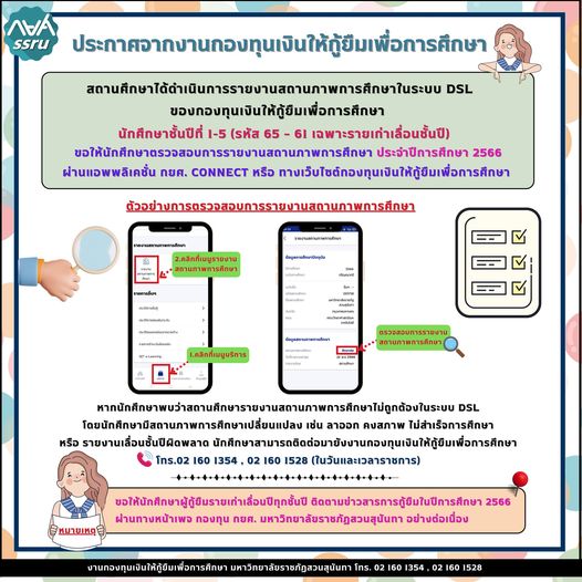 หากนักศึกษาพบว่าสถานศึกษารายงานสถานภาพการศึกษาไม่ถูกต้องในระบบ DSL โดยนักศึกษามีสถานภาพการศึกษาเปลี่ยนแปลง เช่น ลาออก คงสภาพ ไม่สำเร็จการศึกษา หรือ รายงานเลื่อนชั้นปีผิดพลาด นักศึกษาสามารถติดต่อมายังงานกองทุนเงินให้กู้ยืมเพื่อการศึกษา โทร.02 160 1354 , 02 160 1528 (ในวันและเวลาราชการ)