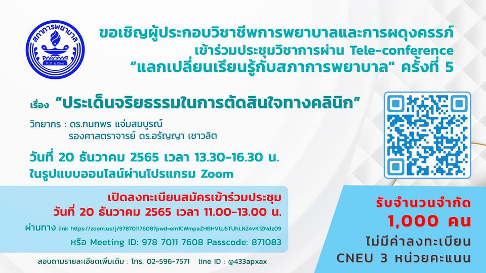 สภาการพยาบาลขอเชิญผู้ประกอบวิชาชีพการพยาบาลและการผดุงครรภ์ลงทะเบียนเข้าร่วมประชุมวิชาการผ่านการสื่อสารทางไกล หรือTele-conference “แลกเปลี่ยนเรียนรู้กับสภาการพยาบาล" ครั้งที่ 5 เรื่อง “ประเด็นจริยธรรมในการตัดสินใจทางคลินิก” วันที่ 20 ธันวาคม 2565 เวลา 13.30-16.30 น. ณ ห้องประชุมและเครือข่ายออนไลน์ สภาการพยาบาล