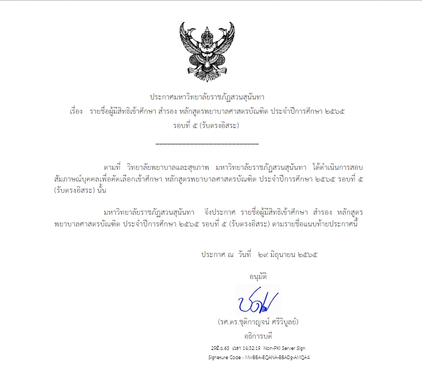 รายชื่อผู้มีสิทธิ์เข้าศึกษาสำรอง หลักสูตรพยาบาลศาสตรบัณฑิต ประจำปีการศึกษา 2565 รอบ 5 ประเภทรับตรงอิสระ รายละเอียดการรายงานตัวและมอบตัว