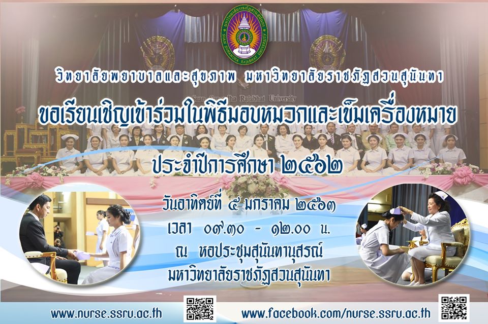 ขอเชิญเข้าร่วมในพิธีมอบหมวกและเข็มเครื่องหมายสำหรับนักศึกษาพยาบาลชั้นปีที่ 2 ประจำปีการศึกษา 2562