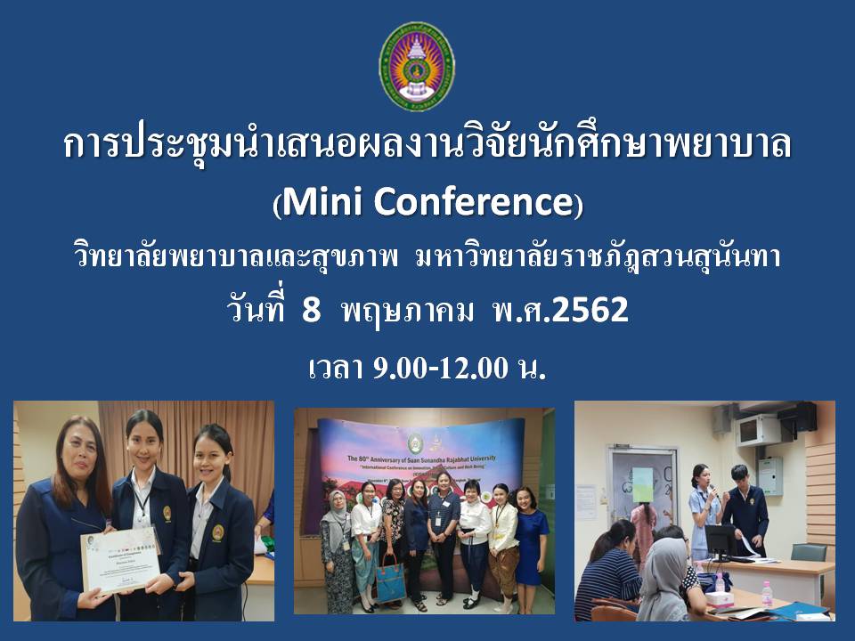 นักศึกษาพยาบาลชั้นปีที่ 4 ได้จัดงานประชุมการนำเสนองานวิจัยของนักศึกษาประจำปีการศึกษา 2561 ในวันที่ 8 พค 2562 ที่วิทยาลัยพยาบาลและสุขภาพเวลา 9.00-12.00 น. เพื่อเผยแพร่ ผลงานด้านการวิจัยของนักศึกษาพยาบาลก่อนสำเร็จการศึกษา ขอเชิญผู้สนใจส่งใบสมัครเข้าร่วมการประชุมตามใบสมัครที่แนบ