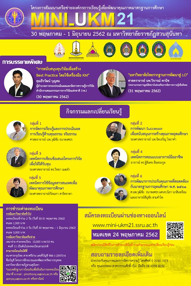 > ขอเชิญสมัครเข้าร่วม “โครงการการสัมมนาเครือข่ายองค์กรการเรียนรู้เพื่อการพัฒนาคุณภาพมาตรฐานการศึกษา(Mini_UKM) ครั้งที่ 21”