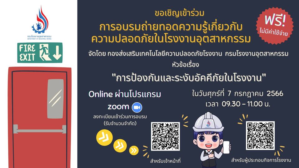 ขอเชิญเข้าร่วม ฝึกอบรมเกี่ยวกับความปลอดภัยในโรงงานอุตสาหกรรม สำหรับเจ้าหน้าที่ ผู้ประกอบกิจการโรงงาน และผู้สนใจ ในหัวข้อเรื่อง