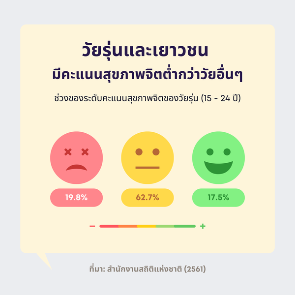 วันนี้อยากชวนทุกคนมาดู สถิติคะแนนสุขภาพจิตในแต่ละวัยจากสำนักงานสถิติแห่งชาติในปี 2561 และแต่ละช่วงอายุ มักพบปัญหาสุขภาพจิตเรื่องใดบ้าง มาดูไปพร้อมเถอะ !