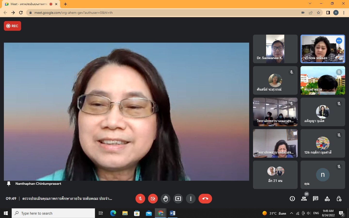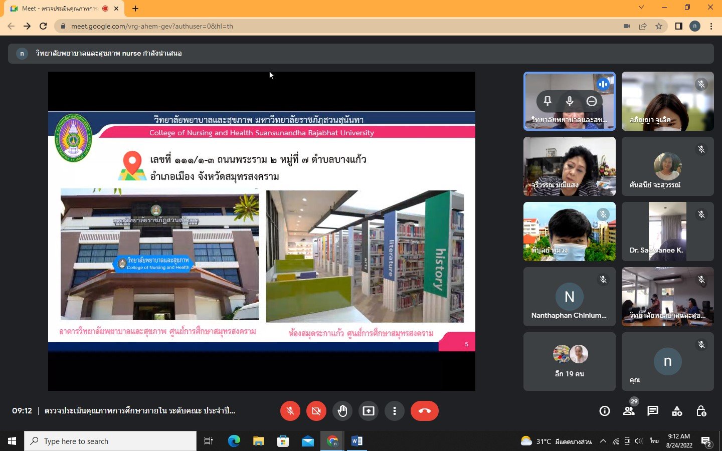 วันที่ 24 สิงหาคม 2565 ผู้ช่วยศาสตราจารย์ ดร.พรพรรณ วรสีหะ คณบดีวิทยาลัยพยาบาลและสุขภาพ พร้อมด้วยผู้บริหารและบุคลากรวิทยาลัยพยาบาลและสุขภาพ ต้อนรับคณะกรรมการตรวจประเมินคุณภาพการศึกษาภายใน ระดับคณะ ประจำปีการศึกษา 2564 ผ่านระบบออนไลน์ Google Meet โดยวิทยาลัยฯ ได้รับเกียรติจากผู้ทรงคุณวุฒิภายนอก 3 ท่าน ได้แก่ อาจารย์ ดร.จุรีวรรณ มณีแสง ประธานคณะกรรมการฯ ผู้ช่วยศาสตราจารย์ ดร.นันทพันธ์ ชินล้ำประเสริฐ อาจารย์ ดร.เสาวนีย์ กาน์เดชารักษ์ กรรมการฯ ผู้ทรงคุณวุฒิภายใน 1 ท่าน คือ ผู้ช่วยศาสตราจารย์ ดร.ศันสนีย์ จะสุวรรณ กรรมการฯ และเลขานุการ 2 ท่าน คือ นายพิบูลย์ พูม่วง และนางสาวอภิญญา จูเลิศศักดิ์ โดยการตรวจประเมินในครั้งนี้มีวัตถุประสงค์เพื่อพัฒนาคุณภาพการศึกษาของวิทยาลัยตามปณิธานและภารกิจหลักของมหาวิทยาลัย